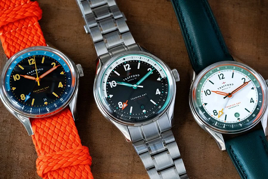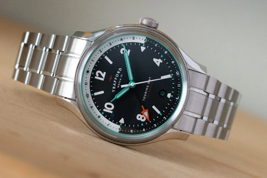The Trafford Touring GMT is a standout travel watch that combines vintage charm with modern functionality. Its 39mm case diameter, 11mm thickness, and 46mm lug-to-lug length make it perfectly proportioned for a variety of wrist sizes. The integrated bracelet adds a seamless look and exceptional comfort, while the watch is powered by the trusted Miyota 9075 automatic movement, featuring a true GMT complication.